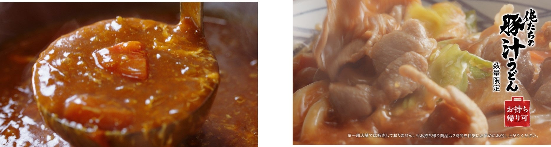 ※提供商品は、『トマたまカレーうどん』『とろけるチーズのトマたまカレーうどん』『俺たちの豚汁うどん』