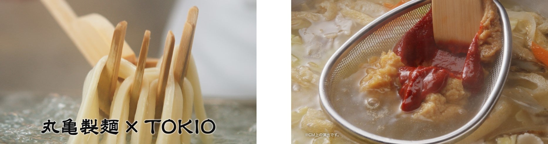 丸亀製麺の実店舗で撮影された今回の新TVCM 丸亀製麺×株式会社TOKIO「もうやみつき!トマたまカレー&豚汁うどん」篇では、松岡さんと麺職人が『トマたまカレーうどん』と『とろけるチーズのトマたまカレーうどん』、『俺たちの豚汁うどん』を真剣につくる様子をお届けします。