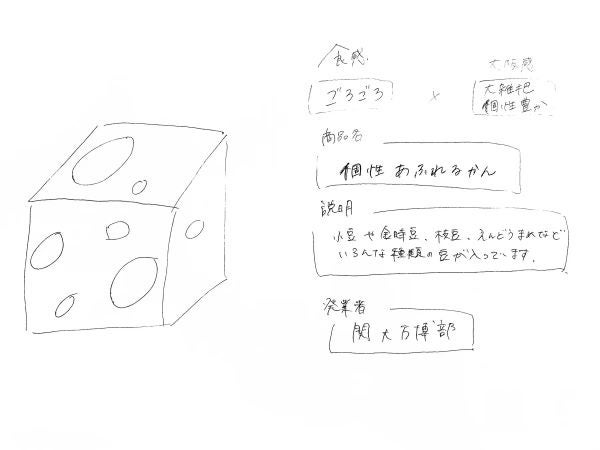 大阪人の個性豊かな様を、小豆・金時豆・うぐいす豆など、色や大きさが様々な豆を甘露煮にしてようかんに閉じ込め表現しました。こちらは飯田妃美香さん(社会学部4年生)のアイデアです。シンプルながら見た目も美しく、食べたときにはゴロゴロとした豆の食感と個性ある味が楽しめる、まさに「個性たのしもー!」なようかんです。