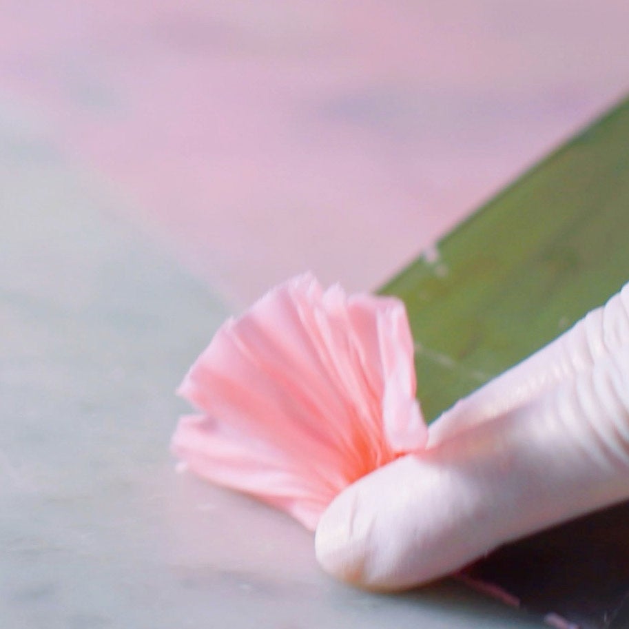 職人が1枚1枚丁寧にチョコレートをけずり、カーネーションのケーキをつくる工程です。ぜひご覧ください。