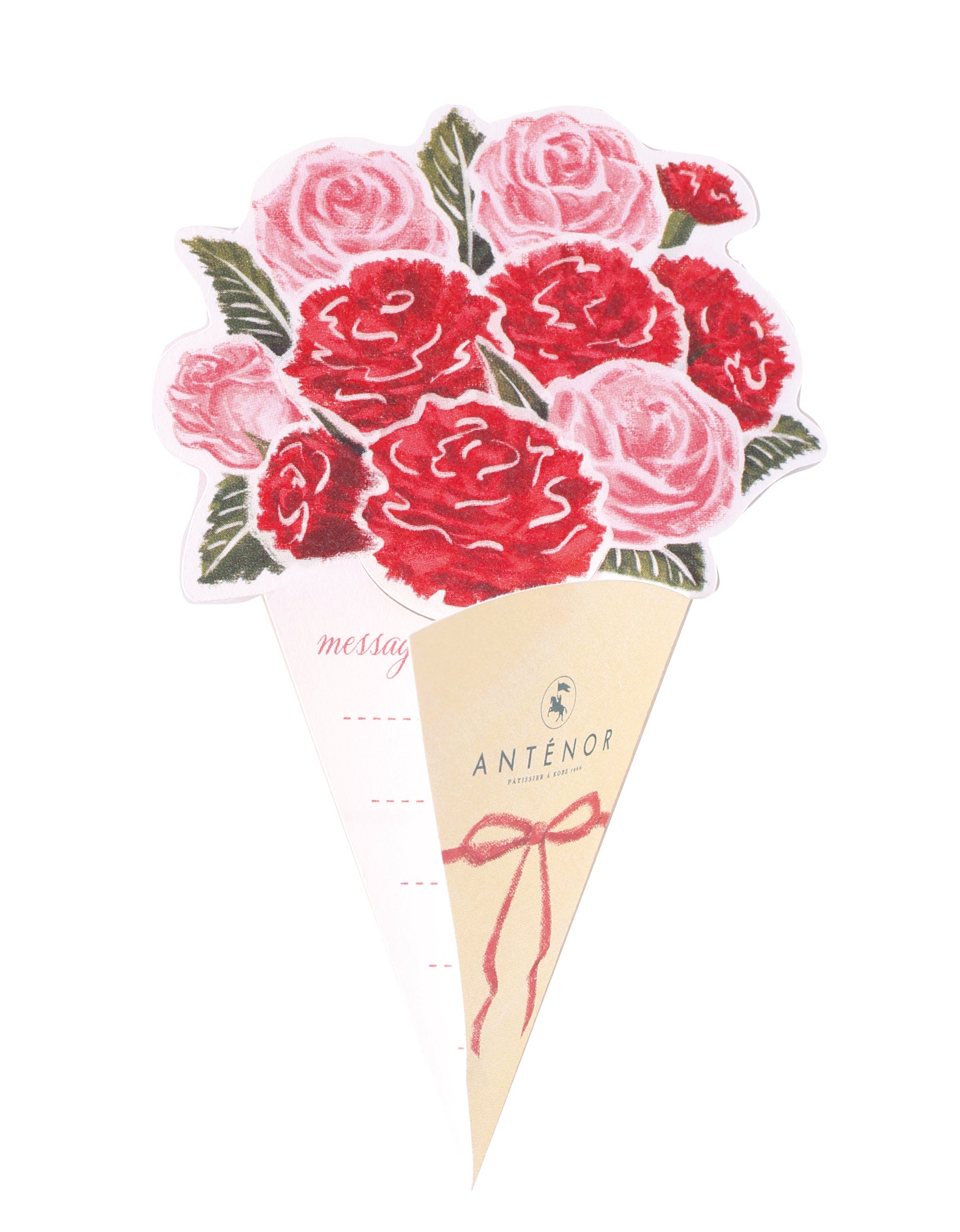 5/10~5/12の期間中、アンテノールの店頭にて商品をお買い上げいただいたお客様に、カーネーションの花束をデザインしたメッセージカードを無料でお付けできます。(右画像)中にメッセージを書いて、おかあさんに日頃の感謝を伝えませんか。