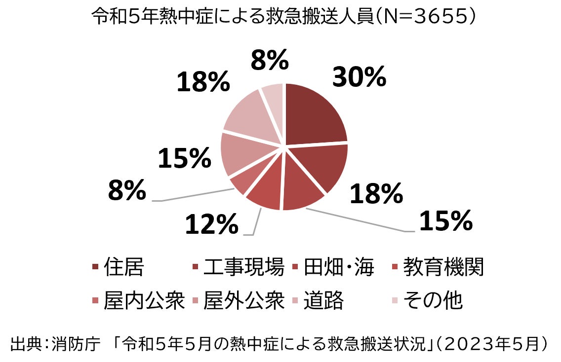 その中でも屋外は全体の30%以上を占めており、春であっても、おでかけ先での熱中症のリスクは軽視できません。屋外で過ごすことによる熱中症の危険性は見過ごすことのできない大きな脅威となっています。
