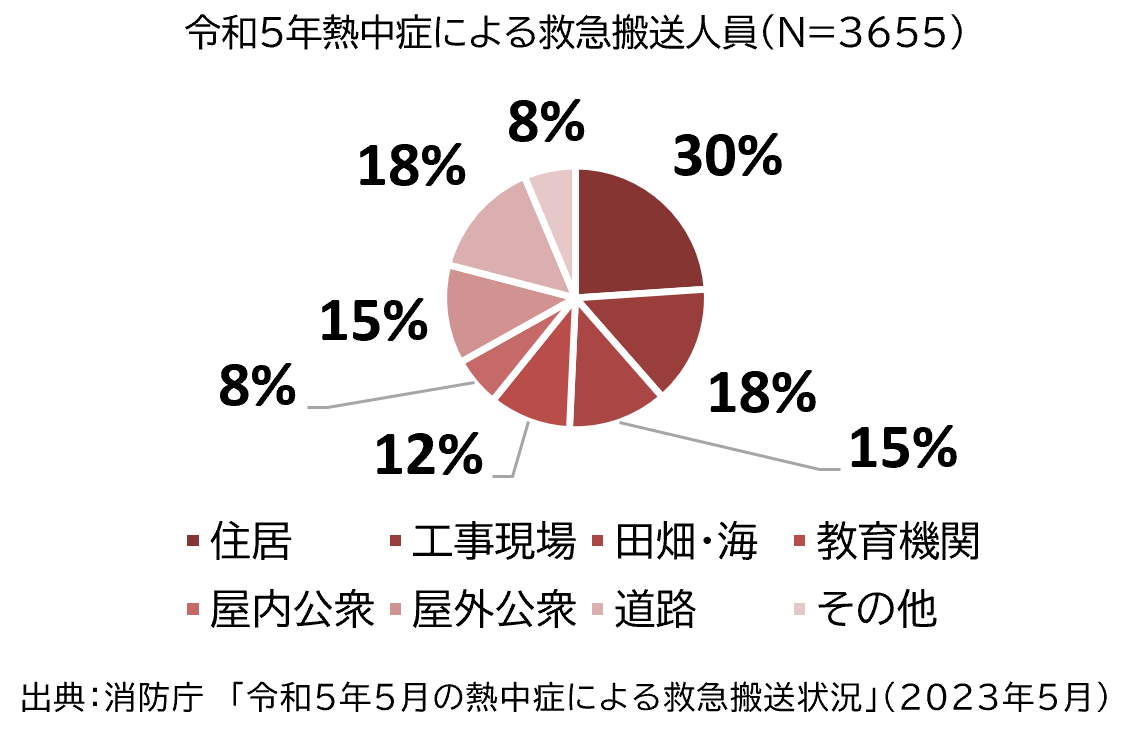 その中でも屋外は全体の30%以上を占めており、春であっても、おでかけ先での熱中症のリスクは軽視できません。屋外で過ごすことによる熱中症の危険性は見過ごすことのできない大きな脅威となっています。