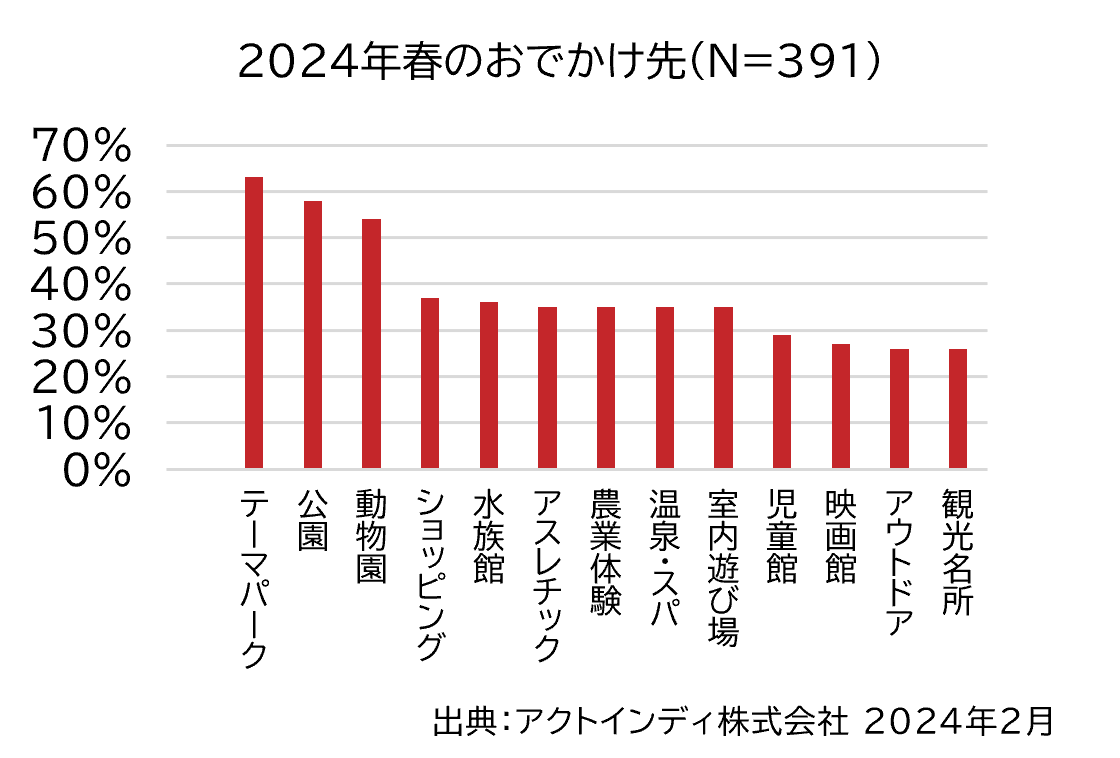 今年の3~4月にかけての人気のお出かけ先は「テーマパーク」が63%と最も高く、