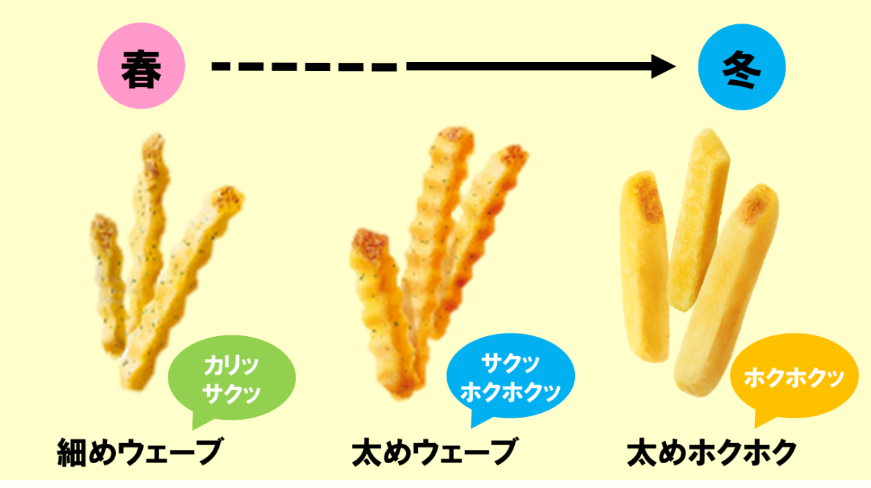 昨年より「Jagabee」では、じゃがいもの多様なおいしさを楽しんでいただきたいという想いから、季節ごとに食感バリエーションを変えた「季節のフレンチフライシリーズ」を展開しています。「味わい」と「カット」を組み合わせた、その時季にしか会えない商品となっています。