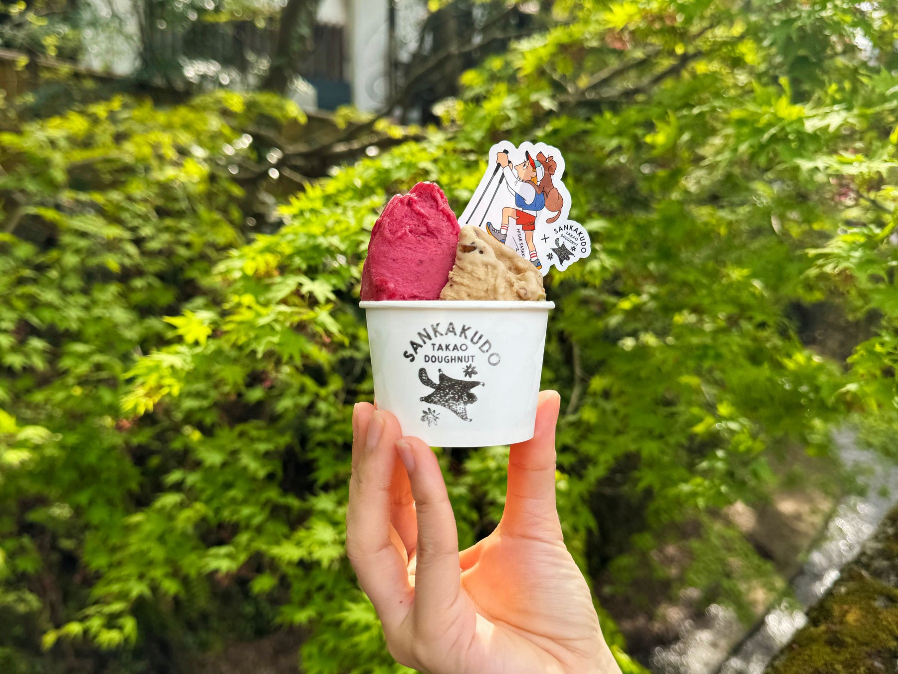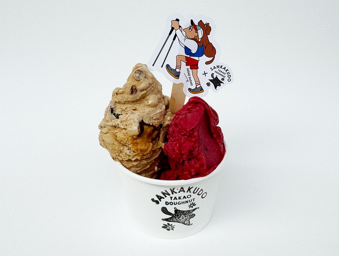 期間中、「高尾 さんかく堂」の看板商品である「森の木の実」と「山の果実」のダブルジェラートを注文していただくと、オリジナルのステッカーをおつけいたします。