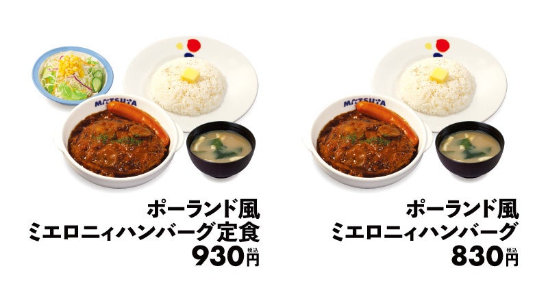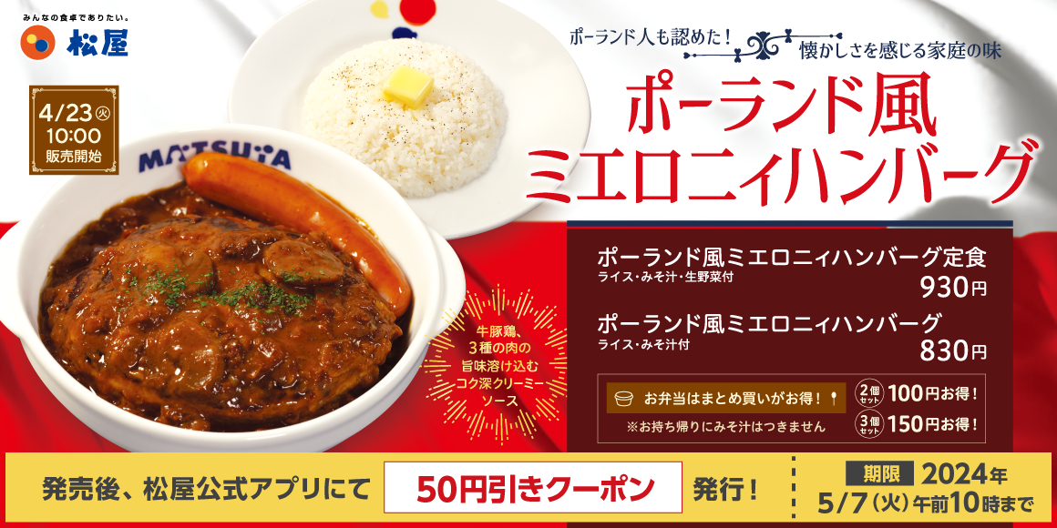 商品名 ポーランド風ミエロニィハンバーグ(ライス・みそ汁付き) 830円 ポーランド風ミエロニィハンバーグ定食 (ライス・みそ汁・生野菜付き) 930円 ※お持ち帰りいただけます。お持ち帰りにみそ汁は付きません。 お持ち帰りの場合、みそ汁は別途60円でお求めいただけます。 ※税込み価格です。 ※株主優待券は上記メニューにご使用いただけます。 ※ライスおかわり無料店舗におけるライスのおかわりは「どんぶりにライスのみ」での提供となります。 発売日 2024年4月23日(火)午前10時 ~ 対象店舗 一部店舗を除く全国の松屋 |