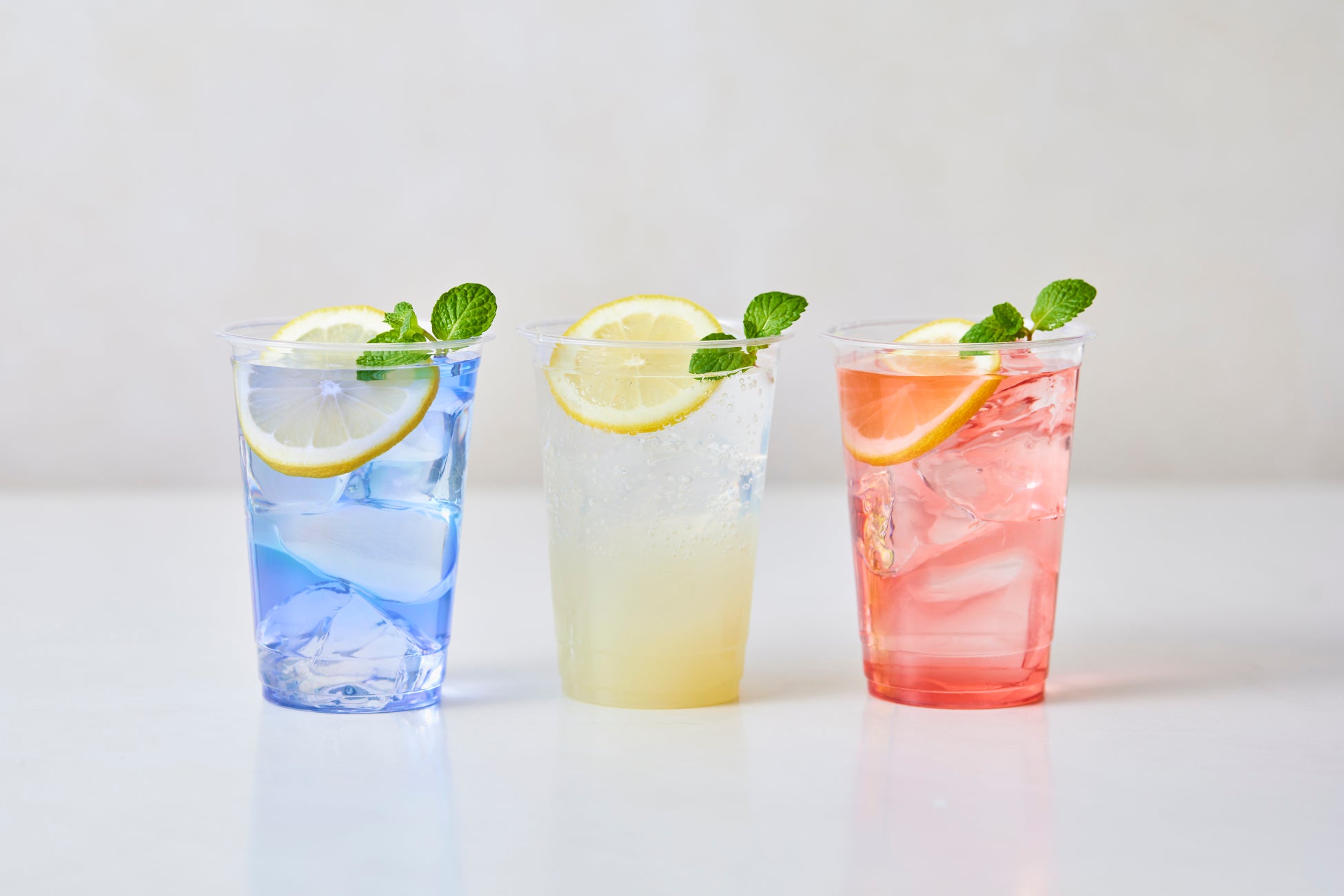 左から、バタフライピーティー/レモネード/ハイビスカス&ローズヒップティー 各¥500(税抜)