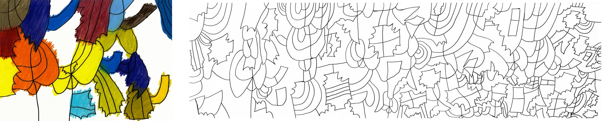 「クッキーのアトリエ」では、ここでしかできないアート体験も用意しています。店内2Fには、 「クッキーのアトリエ」のコンセプトを文字でつなぎ描いた作品が、巨大ウォールアートとして展示されています。ここではご来場したお客様が「クッキーのアトリエ」で体感した色を塗る「Paint Your Colors」と題した企画を実施します。小林氏が制作した線画の作品にお客様が塗り絵をしていき、期間中に皆でつないで1つの色彩画を創り上げていきます。クッキーのアトリエで感じた色をウォールアートで表現してみませんか。