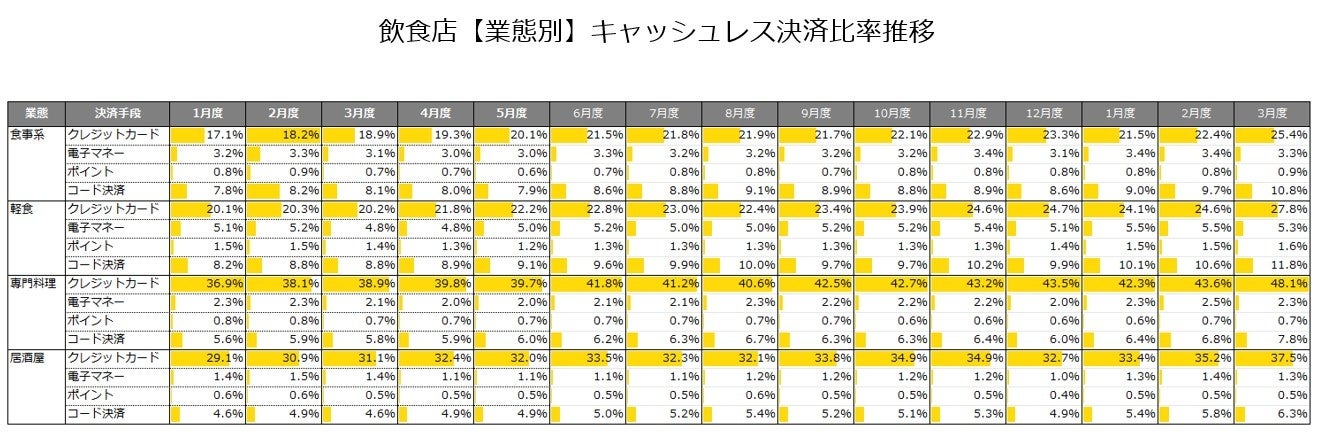 ・2月度から3月度の飲食店【業態別】キャッシュレス決済比率を比較すると、すべての業態で増加した。