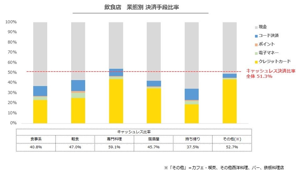 業態別のキャッシュレス比率は、持ち帰り以外で40%を超える。