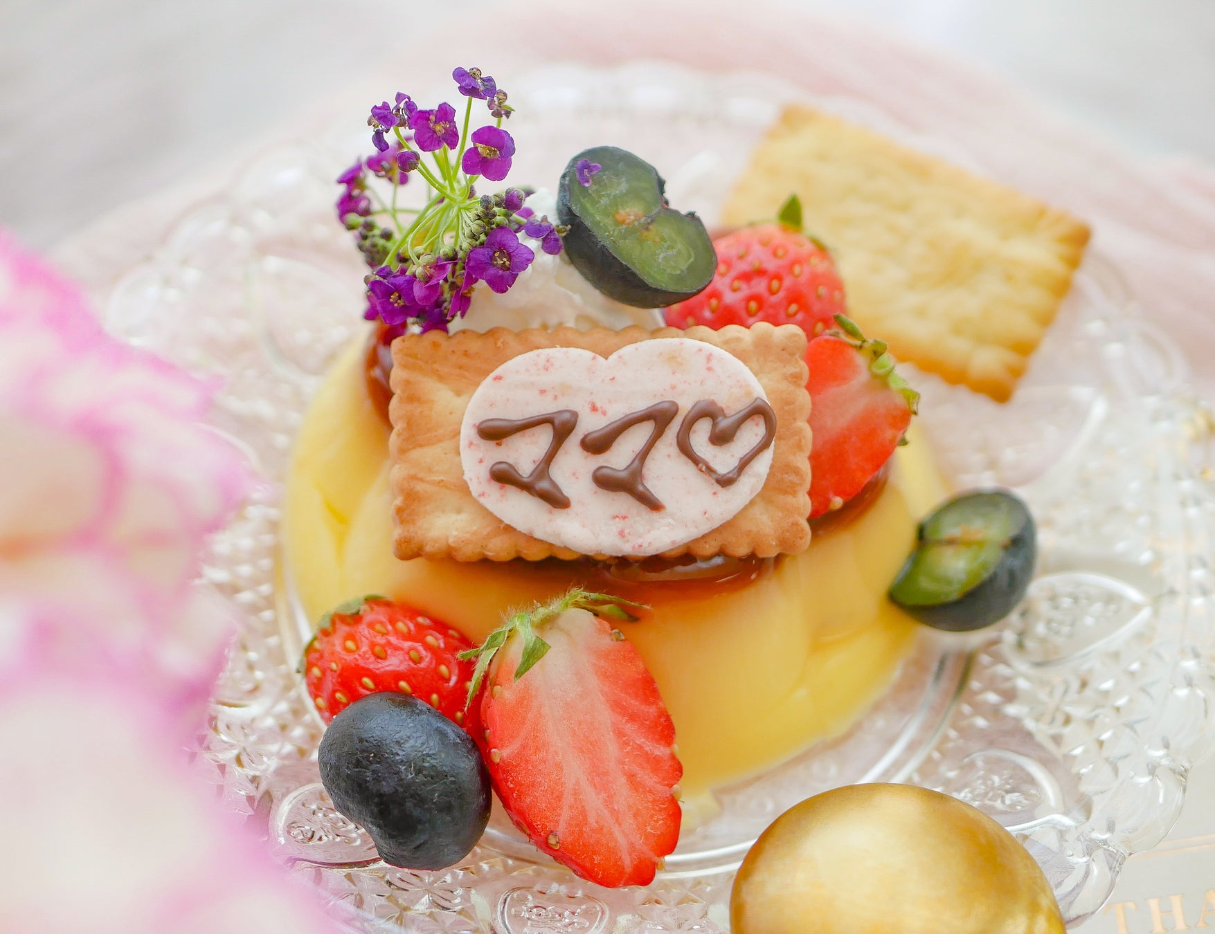 ビスコ<いちご>(1袋)、プッチンプリン1点、生クリーム、いちご、ブルーベリー、エディブルフラワー(食用花)、チョコレートペン