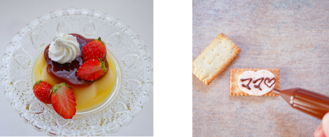 ビスコ<いちご>(1袋)、プッチンプリン1点、生クリーム、いちご、ブルーベリー、エディブルフラワー(食用花)、チョコレートペン