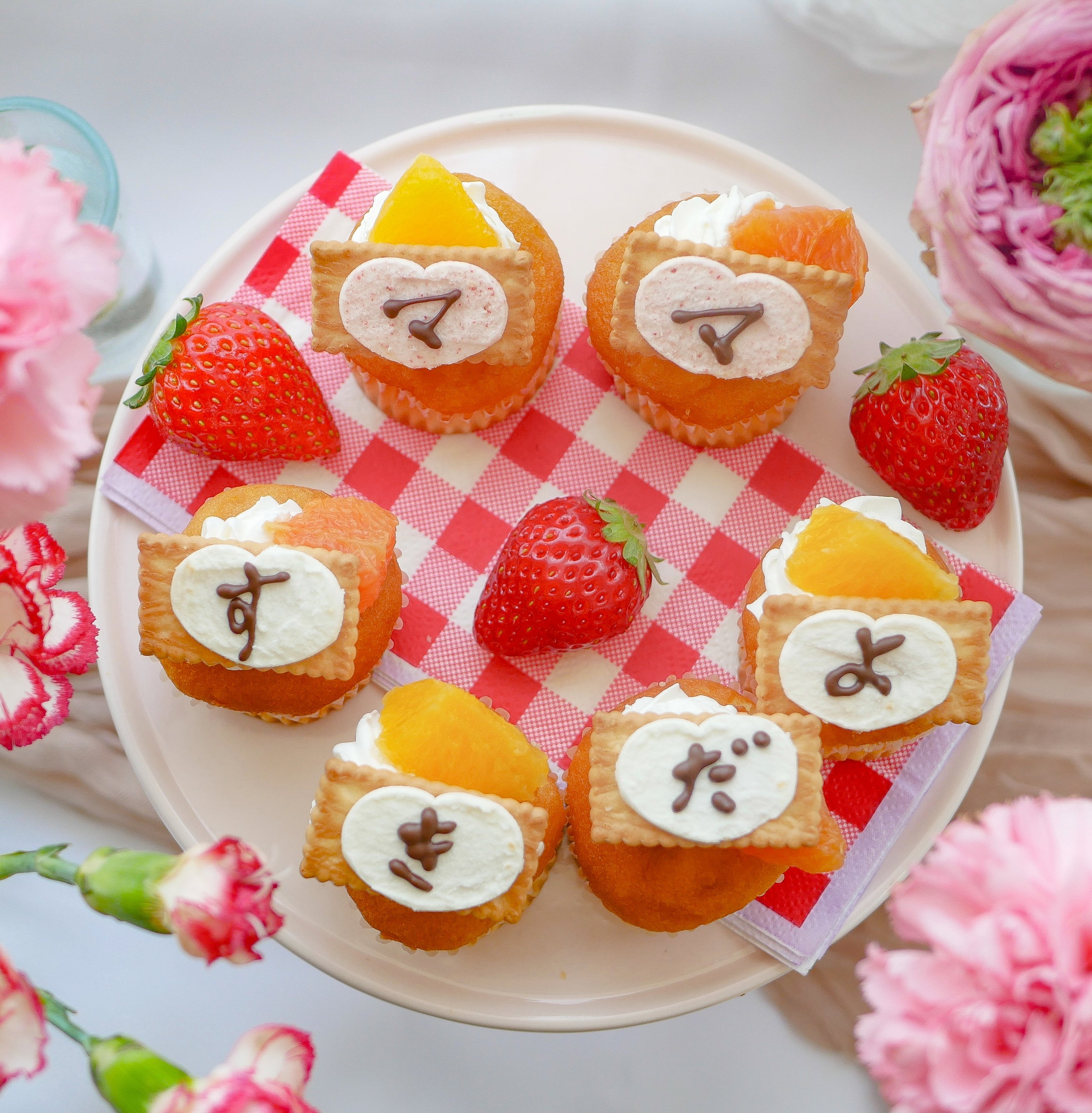 ビスコ<いちご>(1袋)、ビスコ(1~2袋)、カップケーキ、生クリーム、チョコレートペン、いちご、みかん、パインなど