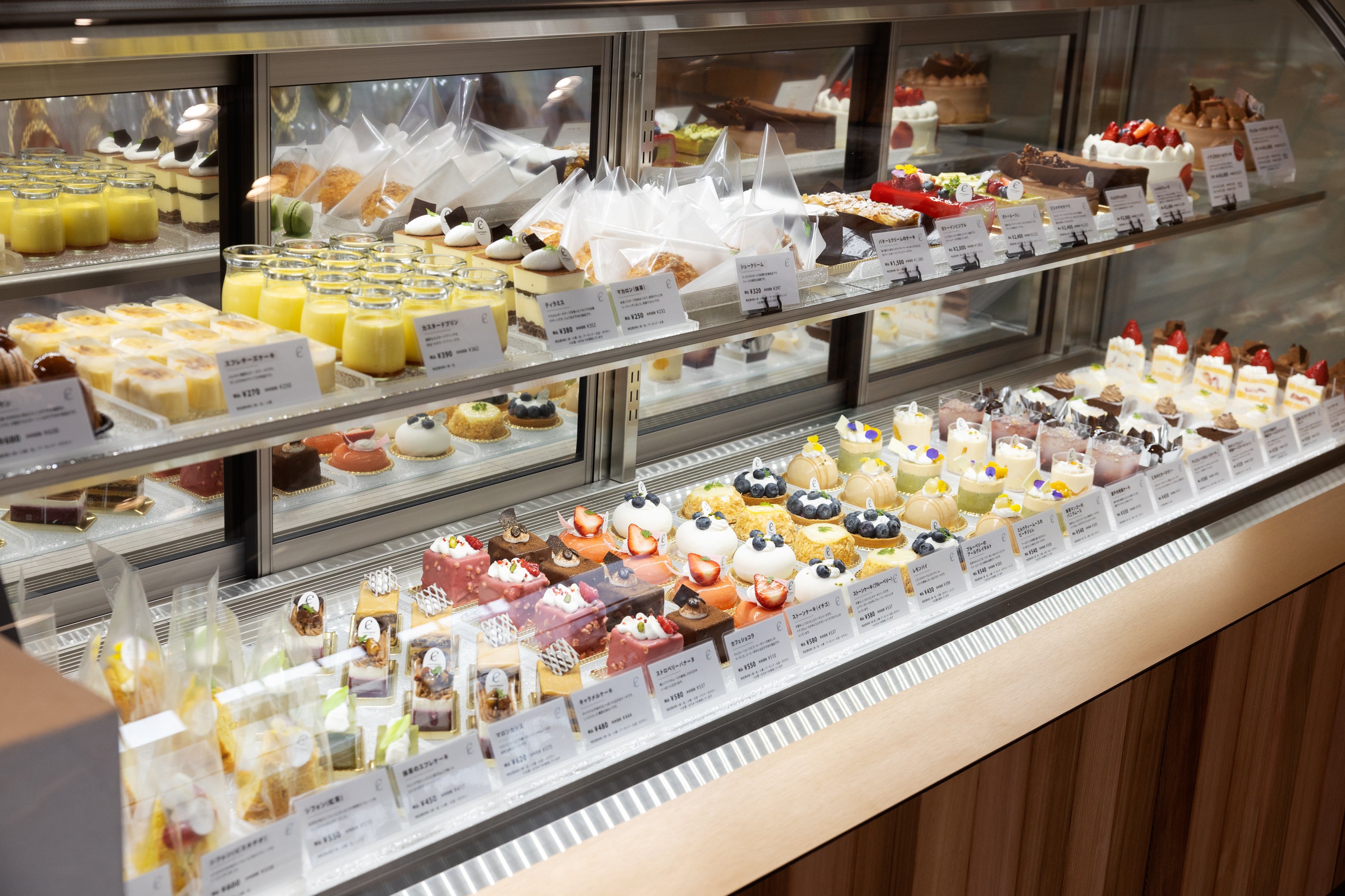 店内のショーケースでお菓子づくりをするパティシエの様子