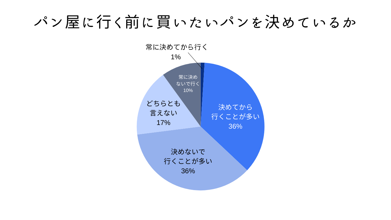 パン屋に行く際、何を買うかあらかじめ決めてから行く人が少数派であることがわかりました。言い換えると、パン屋さんに行って、さまざまな種類の中から選ぶ過程も楽しみにしている人が多いことがわかります。