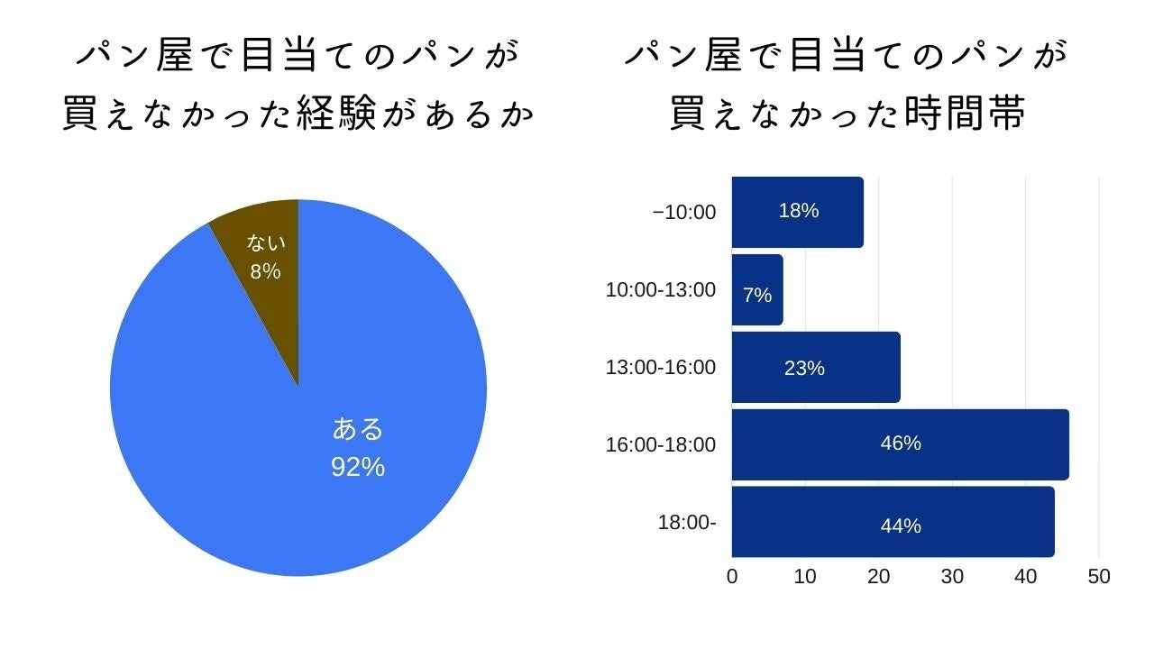 パン屋に品揃えの良さを求めている以上、売り切れが多い状態では十分に満足してもらえないことが多く、パン屋で目当てのパンが買えなかった経験がある人は92%に上りました。特に、16:00以降にお目当てのパンが買えなかった経験がある人は46%、同18:00以降は44%、この2つのいずれかに回答した人は70%に上りました。閉店時間近くは売り切れが出やすいことから、品揃えが悪い印象になりやすいことがわかります。