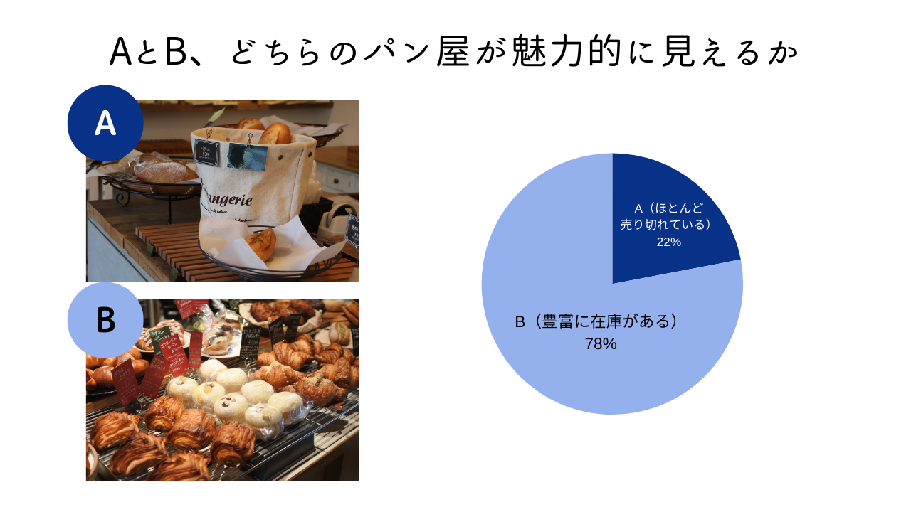 〈結果〉およそ80%の人が在庫が豊富にあるパン屋(B)の方が魅力的と回答。
