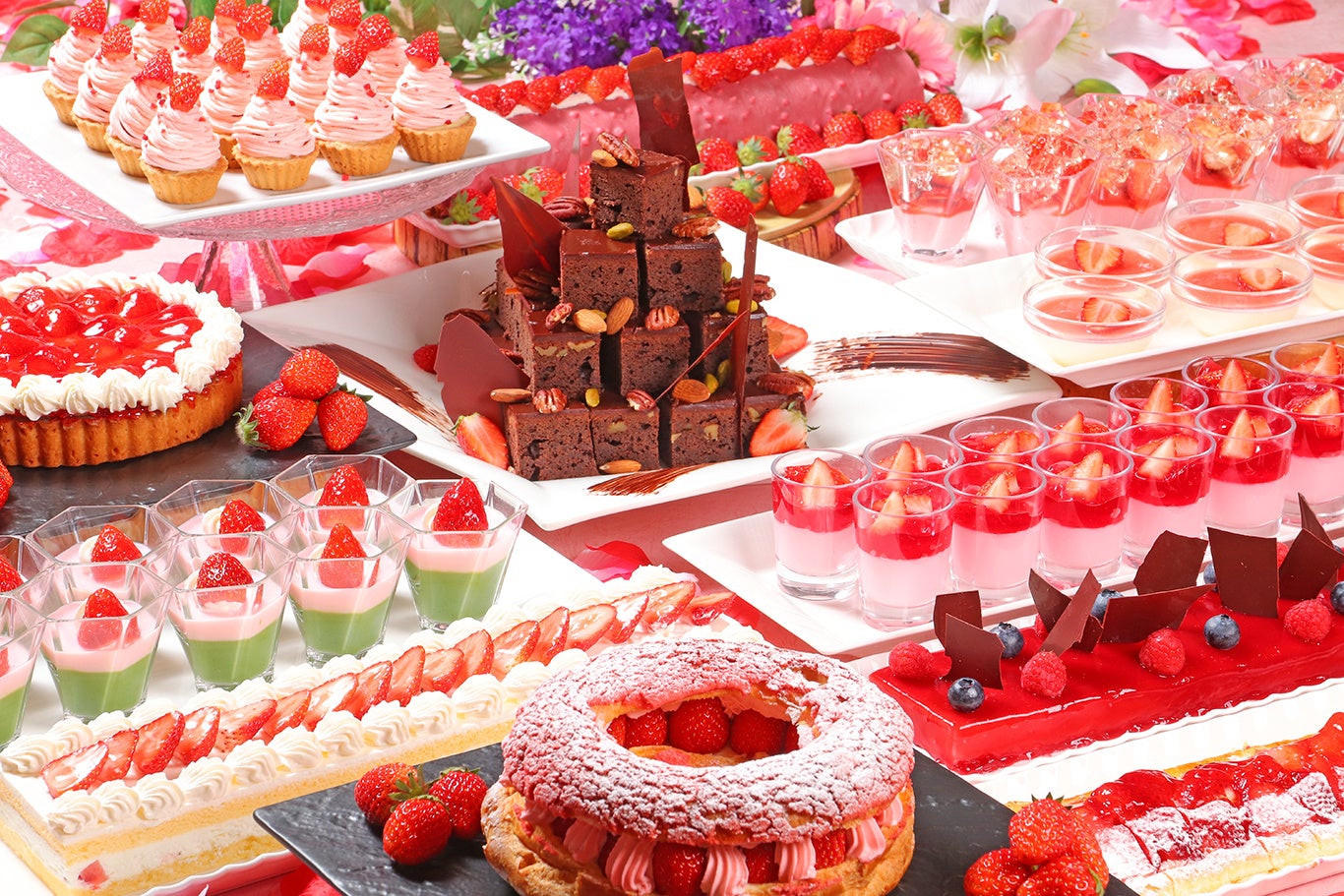 キラキラと輝く苺が宝石のような「苺タルト」やふんわり食感がたまらない「苺のモンブラン」など全23種類からなるスイーツブッフェを主とし、スモークサーモンや生ハムなどお好みのトッピングで楽しむ「ブルスケッタボード」などのセイボリーブッフェ、ご注文をいただいてから出来立てをご用意するパティシエからの特別な一皿「苺のクレープシュゼット バニラアイス添え」など、味覚と視覚を共に満たす贅沢なメニューをお届けいたします。ドイツの老舗紅茶メーカー・ロンネフェルトの紅茶を含む全14種類の飲み放題とのペアリングが演出する贅沢なひと時をお楽しみください。