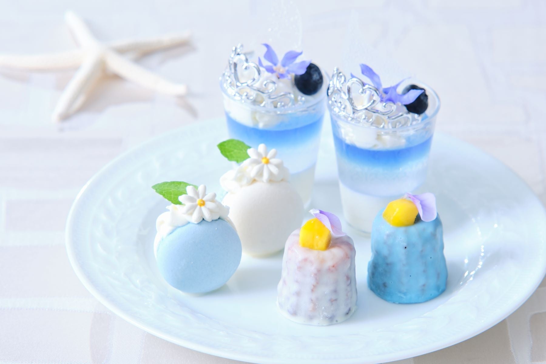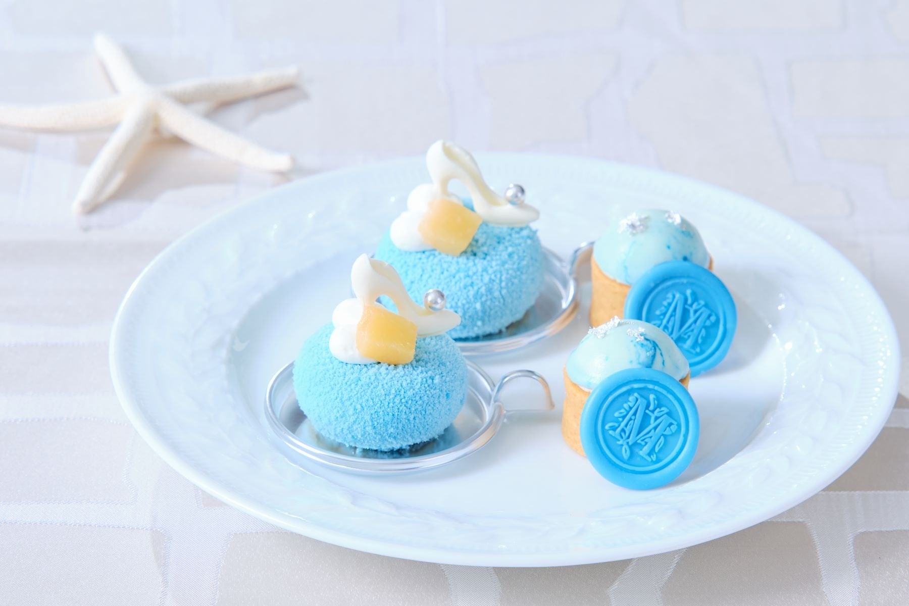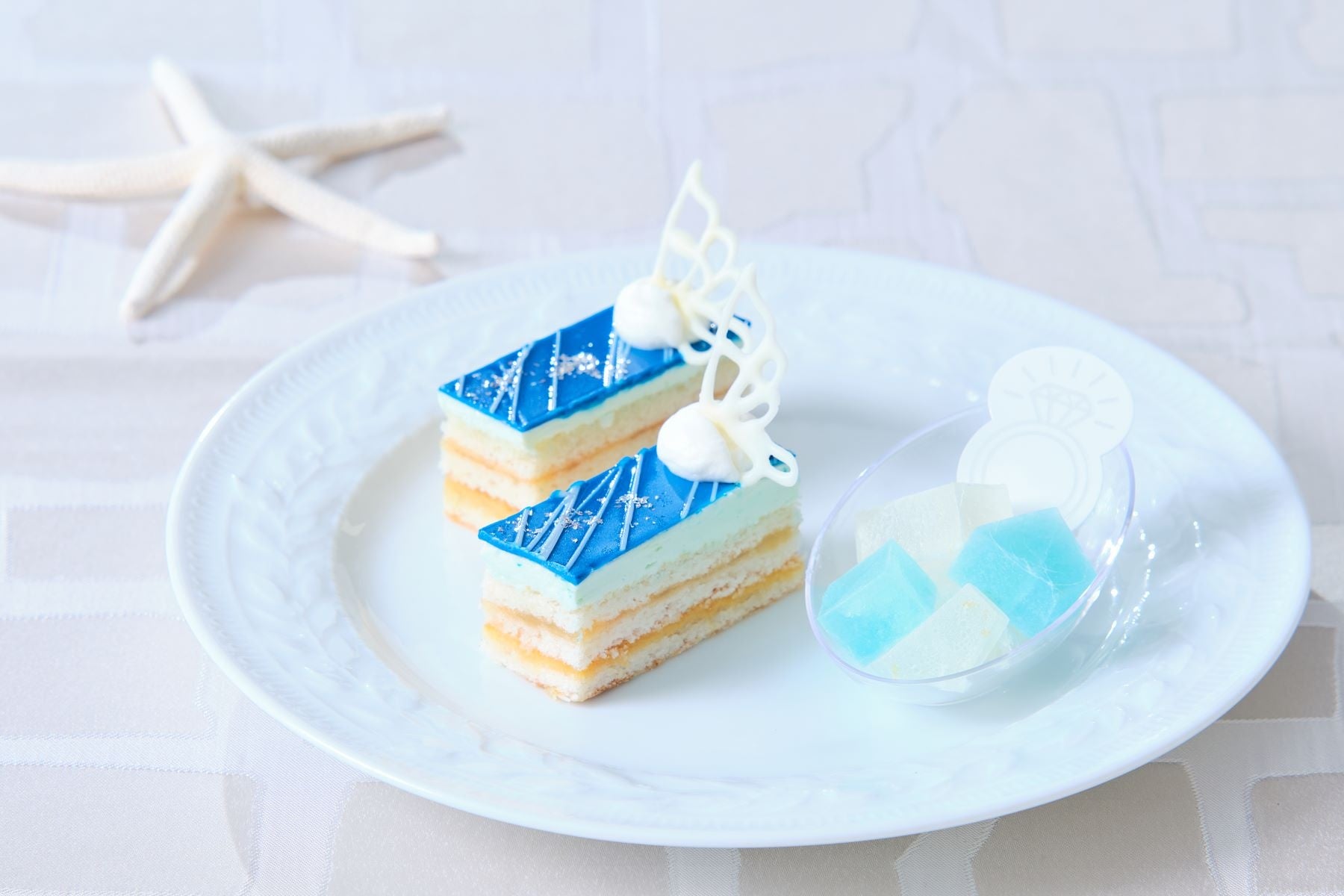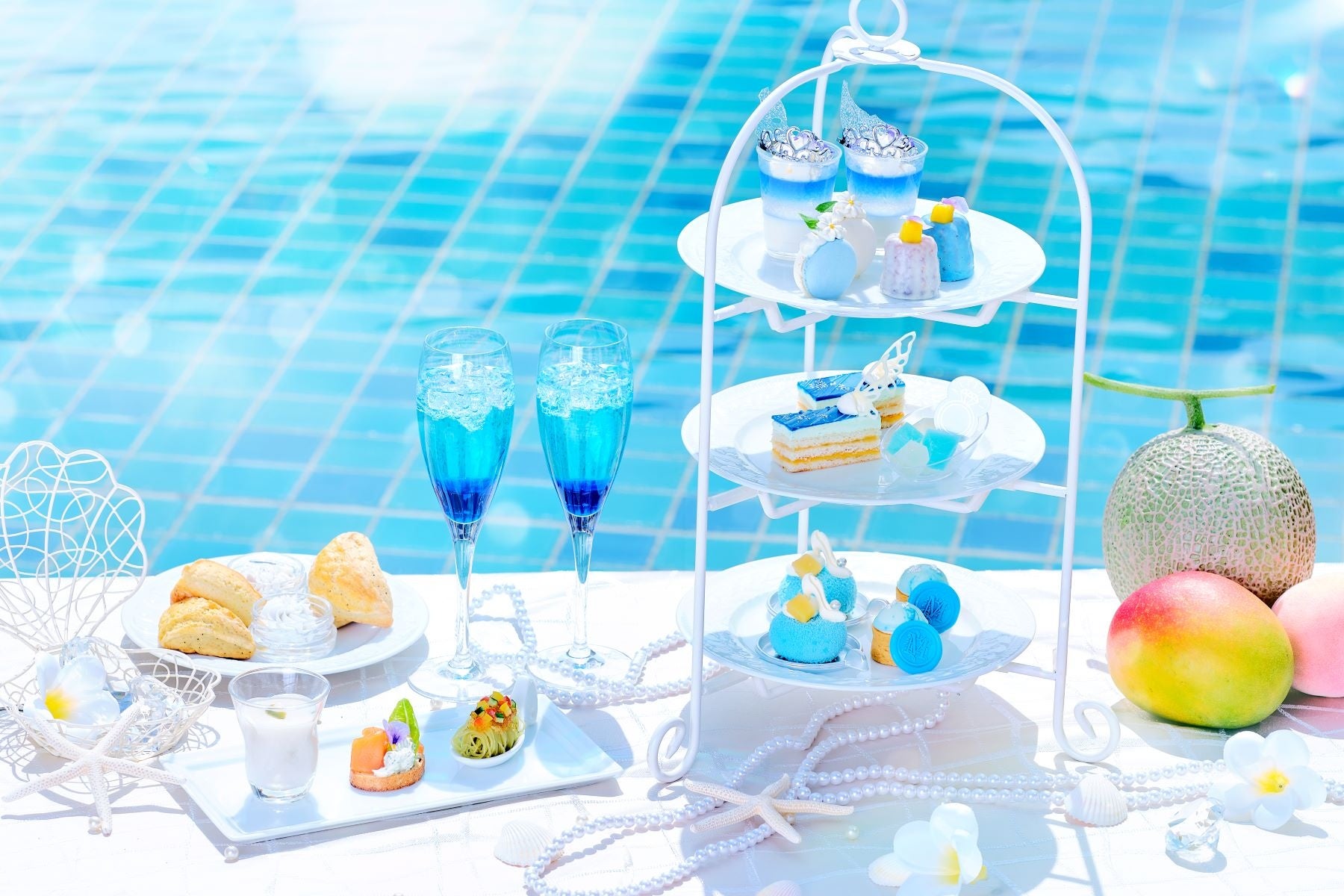 サマーシーズンは“ブルー”をテーマに、ヨーグルトとライチのグラデーションが素敵なヴェリーヌや、レモンとパッションのさわやかな香り広がるオペラ、フルーツとハイヒールが浮かぶ桃のムース、色鮮やかなメロンムースが乗ったミニタルトをはじめ、メロンやマンゴー、桃、ライチ、ココナッツ、ヨーグルトを使用し、清涼感あるさっぱりとした味わいに仕上げました。