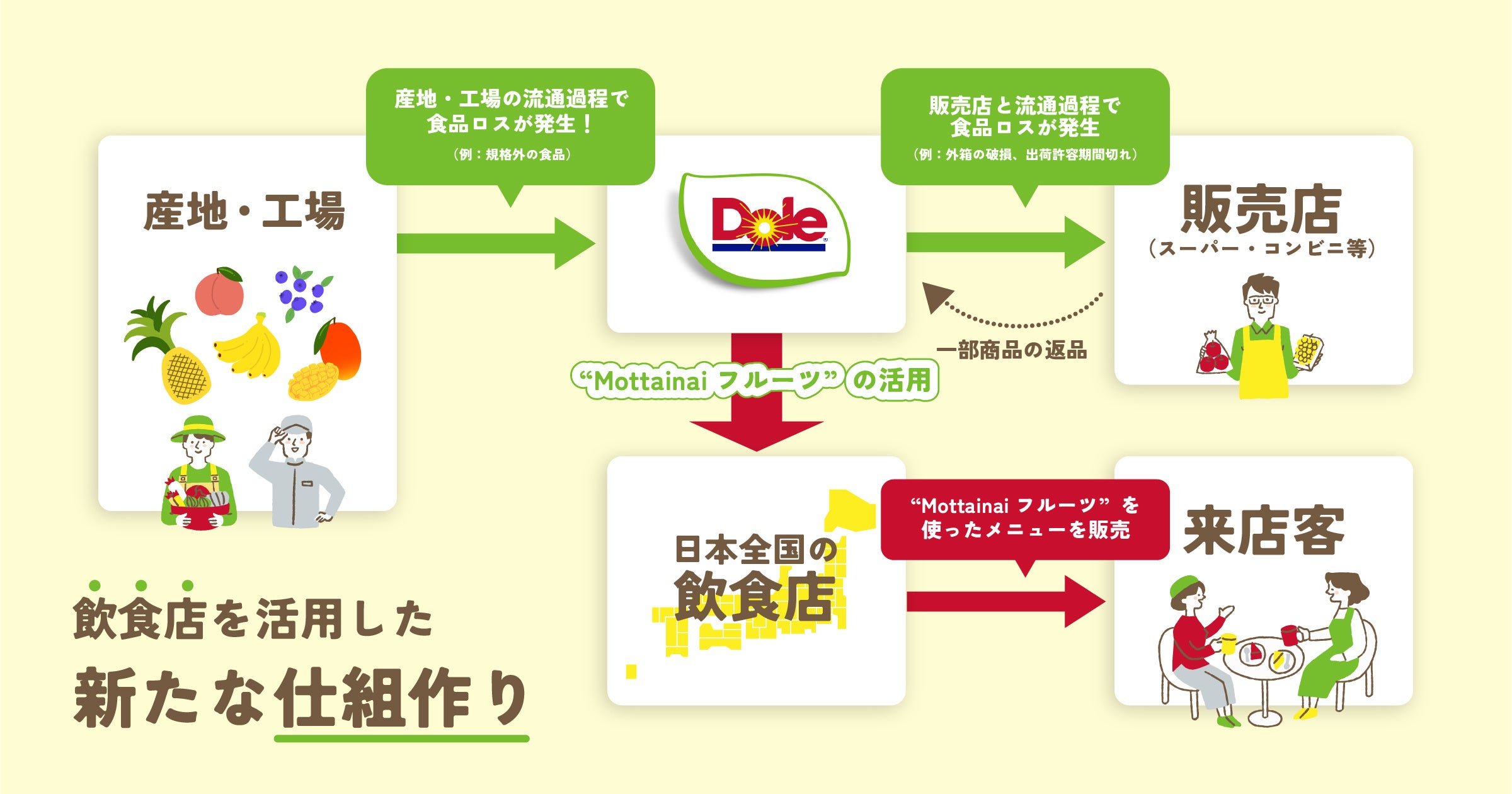 キズやサイズなど“規格外”という理由から産地で廃棄されたり、賞味期限が十分あるにもかかわらず、出荷期限切れや販売期限切れ、外装の破損等で小売などには流通できなくなった商品を販売・利用できる飲食店に再流通するスキームを作ることで、流通プロセスで発生する食品ロスを削減する取り組みになります。“Mottainaiフルーツ”を飲食店で活用する仕組み作りを目指します。