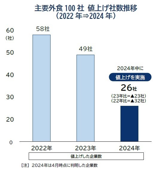 上場する外食主要100社における、2024年の価格改定計画(値上げ、実施済み含む)を調査した結果、4月15日までに値上げを表明したのは26社だった。値上げが本格化した22年(58社)に比べて約4割の水準にとどまったほか、23年(49社)からも半減した。