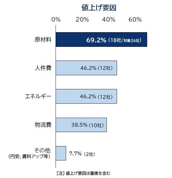 値上げの要因では、値上がりが続く食材などの原材料費に加え、働き手を確保するための賃金アップによる影響が目立った。値上げを表明した外食26社の値上げ要因をみると、最も多いのは「原材料」を要因とした値上げで、18社・約7割を占めた。次いで「人件費」と、水道光熱費など「エネルギー」がともに12社・46.2%だった。飲食店全体では約7割の企業でアルバイトなどの人手不足が発生しており(注2)、アルバイト・正社員スタッフの確保を目的に賃上げ等を行う企業も見られた。「物流費」(10社・38.5%)は、2024年問題などによる物流コストの上昇が響いた。このほか、テナント料の引き上げや、円安による仕入れ負担の増加などがみられた。