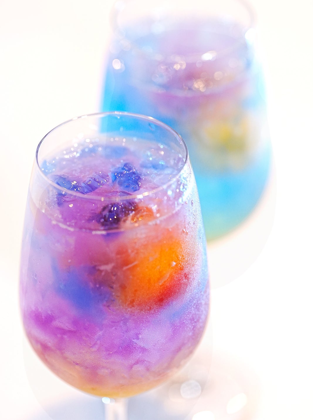紀州産南高梅のオリジナルシロップをベースに、バタフライピーや梅酒などを組み合わせた数タイプのジュレで紫陽花の環境によって花の色が変化するバリエーション豊かな彩りを表現しました。