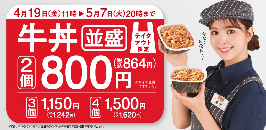 株式会社吉野家(本社:東京都中央区、代表取締役社長:河村泰貴、以下吉野家)は、4月19日(金)11時から5月7日(火)20時までの期間、全国の吉野家店舗*でテイクアウトの牛丼並盛を2個購入すると通常本体価格852円(税込920円)が本体価格800円(税込864円)になるお得なキャンペーンを実施します。期間中は、テイクアウトの牛丼並盛を2個以上お買い求めいただくとお得になります。