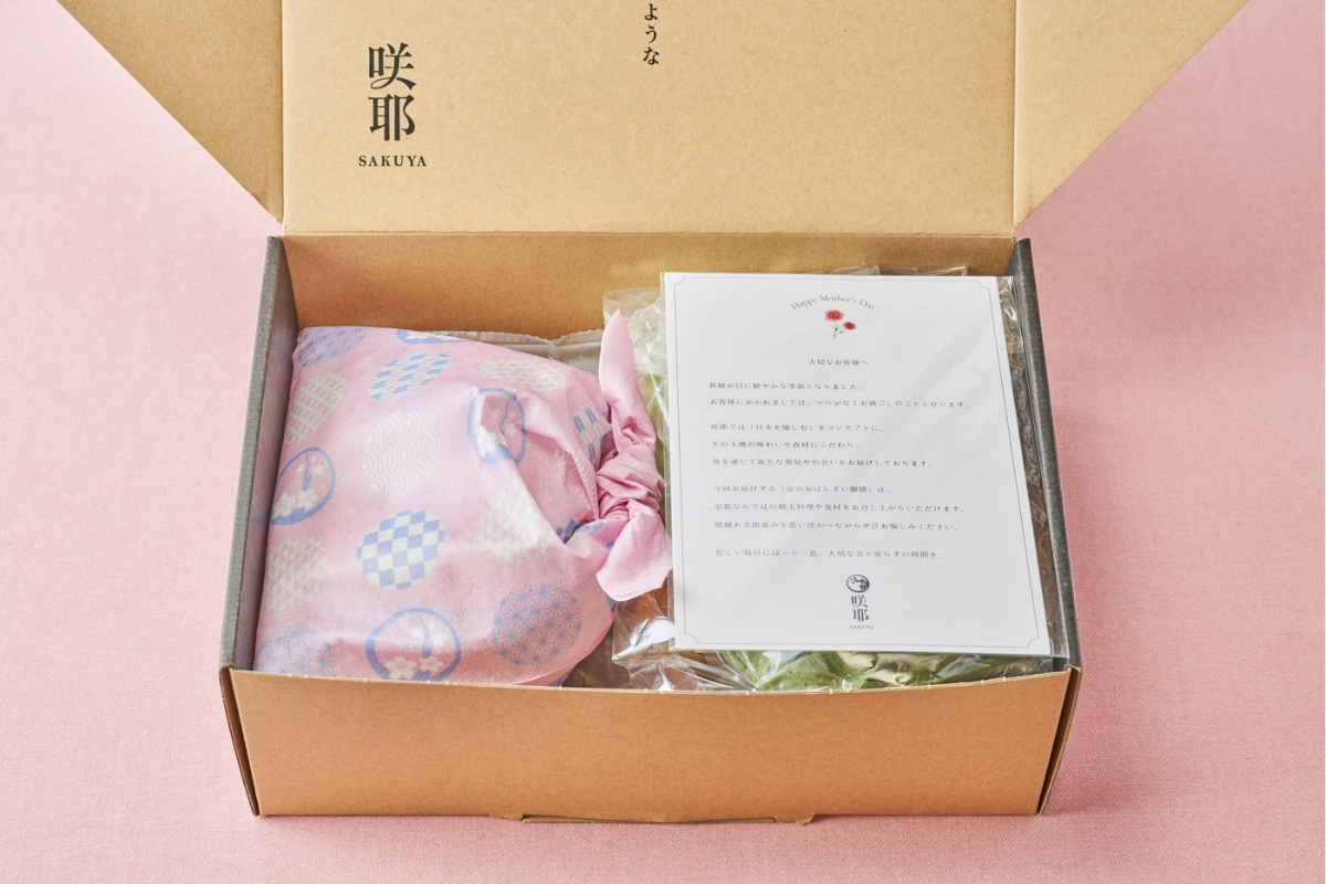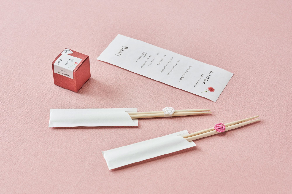 2024年4月19日(金)から5月16日(木)の期間限定で販売する母の日限定キットでは、オリジナルの祝箸やおしながき、祇園辻利のお茶がセットになっており、いつもより華やかで上質なお食事の時間をお楽しみいただけます。