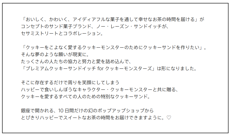 今回ノー・レーズン・サンドイッチは、世界的に人気を誇る「セサミストリート」のキャラクター「クッキーモンスター」とコラボレーションし、”クッキーモンスターのための特別なクッキーサンド” をコンセプトとしたチョコチップクッキーサンド「プレミアムクッキーサンドイッチ for クッキーモンスターズ」を新たに発売しました。Sony Park Miniでは、現在ノー・レーズン・サンドイッチ公式サイトでしか手に入らないこのクッキーサンドが購入できるPOP-UPショップを期間限定でオープンします。