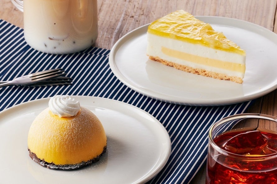 商品は「ハニーレモンタルト」(右)と「フロマージュ・オ・トロピカル」の2種類。ハニーレモンタルトは、まろやかなチーズムースにほどよい酸味のレモンを合わせたスッキリとした味わいです。天面は、ハニーレモンのナパージュ(つや出し)とレモンスライスでデコレーションし、つややかで清涼感のある見た目に仕上げています。なめらかでくちどけの良い食感と爽やかなレモンの香りを、アイスコーヒーやロイヤルミルクティーなどお好みのドリンクとともにお楽しみください。