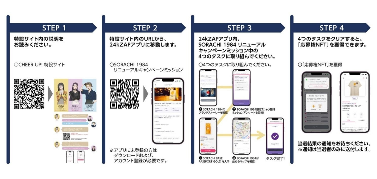 24karat(株)の「24kZAP」アプリをダウンロードし、「サッポロ SORACHI 1984」に関するミッションをクリアして「応募権NFT」を獲得することで応募完了となります。「応募権NFT」を保有している方の中から、最大200名様にキャンペーン第1弾(注2)で最多得票数となったデザインの「サッポロ SORACHI 1984オリジナルデザインTシャツ」1枚をプレゼントします。応募方法は、応募用特設ページ(注3)をご覧ください。