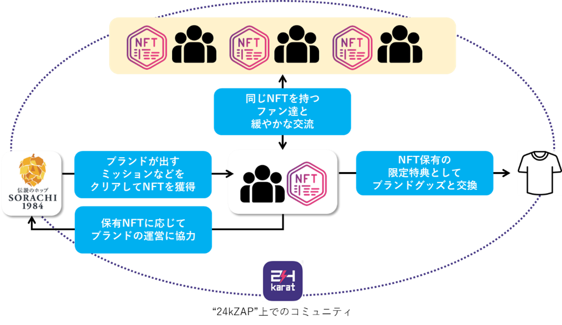 24karat(株)はNFTを活用したコミュニティサービスを運営するスタートアップです。ユーザーが自分自身の「好き」をNFTとして形にしてどこにでも持ち運ぶことができるよう様々なサービスを展開しています。「サッポロ SORACHI 1984」は、24kZAPアプリ内に専用のブランドページを持ち、様々なミッションを通じてトークンを集めることでブランド専用のNFTを獲得できるなど、新しい体験をお届けしています。