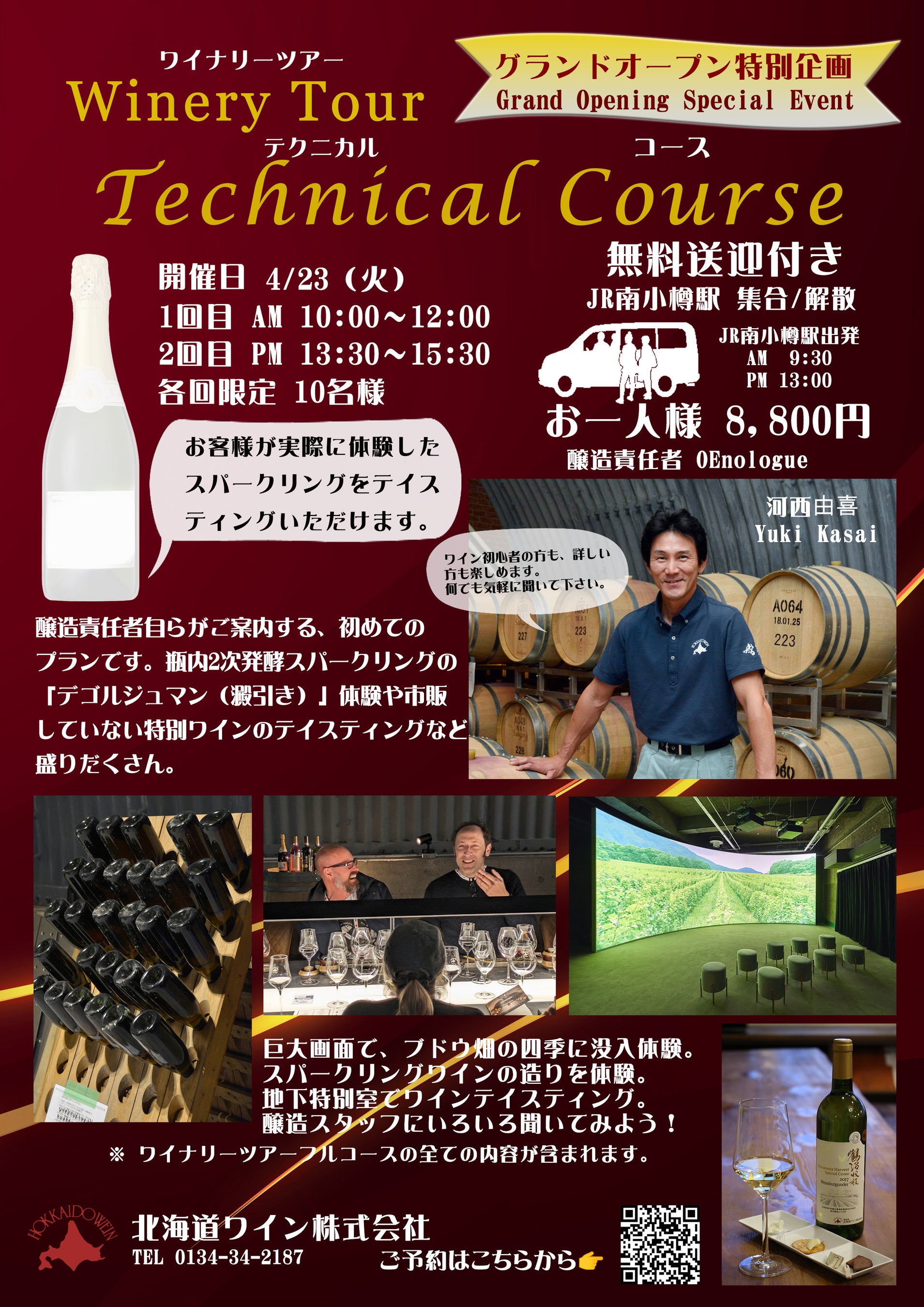 日本ワイン製造メーカーの北海道ワイン株式会社(代表:嶌村公宏、本社:北海道小樽市朝里川温泉1-130)は、『おたるワインギャラリー』グランドオープン当日、記念イベント『テクニカルコース』を開催します。