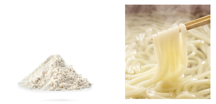 ・食品メーカー様では、本品にコラーゲンたん白、小麦粉を粉体混合します。 ・食塩水を入れて練ります。 ・製麺して茹でた後、冷水で急冷して提供もしくは、再びお湯で温めて提供します。 ・冷凍麺の場合は、冷水で急冷後、急速冷凍して保管します。 ・ボイル又はレンジアップして提供します。 |
