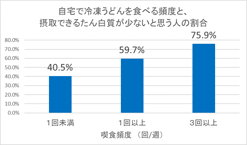 同時に、自宅で冷凍うどんを食べると回答した3,500人を対象にした調査では、食べる頻度が多くなる程、「うどんにはたん白質が少ない」と感じる人が増える傾向にありました。