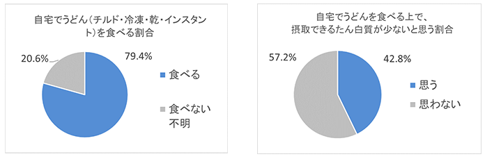 20代以上の男女6,601人にうどんに関する調査を実施した結果、5,239人が自宅でうどん(生・冷凍・乾・インスタントタイプ)を食べていると回答し、その内の42.8%(2,243人)がうどんにたん白質量が少ないと感じていました。