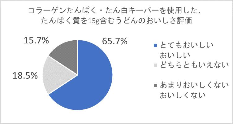 おいしさに関して、本品と新田ゼラチン株式会社のコラーゲンたん白を配合した、たん白質を15g含むうどんを作り、消費者108人に試食調査した結果、65.7%(71人)の人が「とてもおいしい」または「おいしい」と評価したことから、通常のうどんと遜色なく食べることができる風味・食感であることを確認しました。