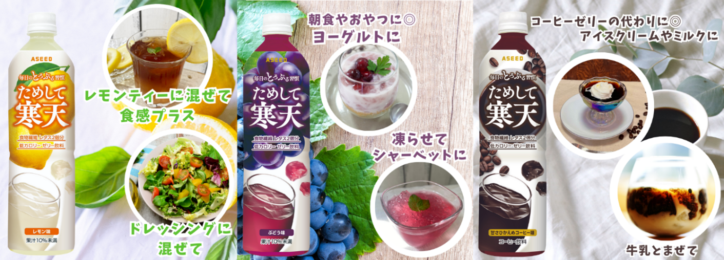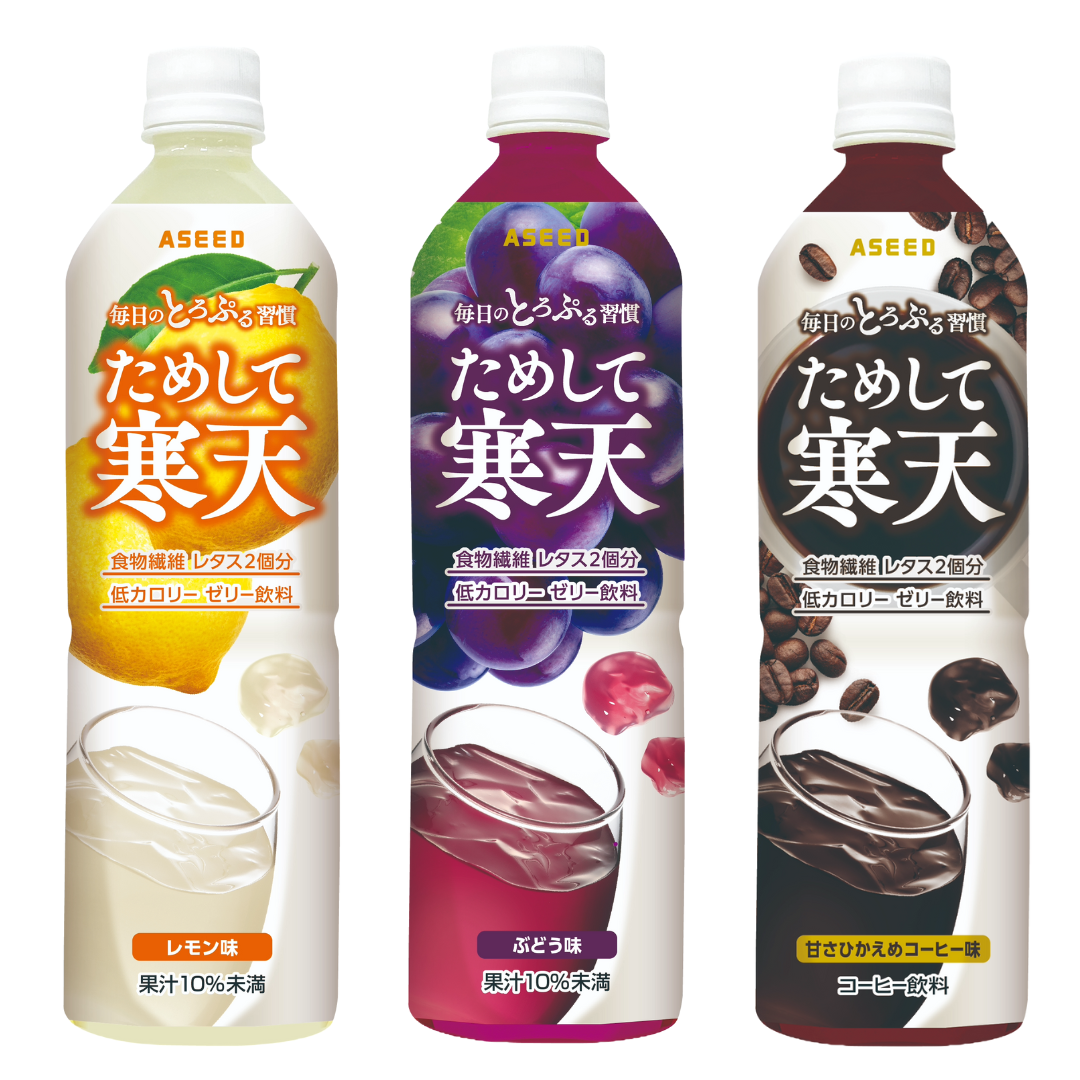 今年で発売19年目を迎える「ためして寒天」は、900mlの大容量サイズの寒天を使用したゼリー飲料では、売上数量No.1の商品です(当社調べ)。とろぷるっとした食感と満足感ある美味しさが特徴で、特に食物繊維を取りたい方やスッキリしたい方を中心に長年ご愛顧いただいております。