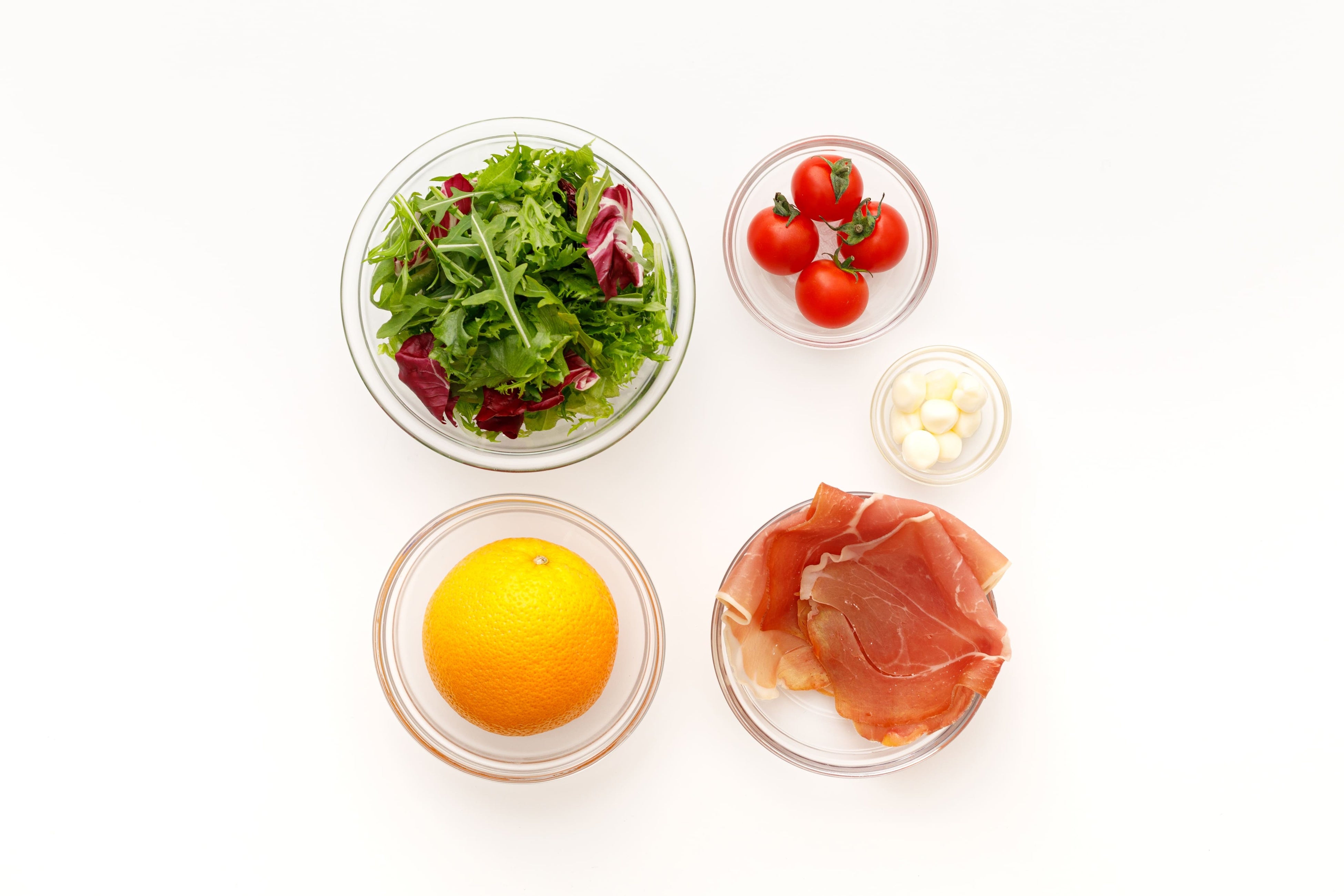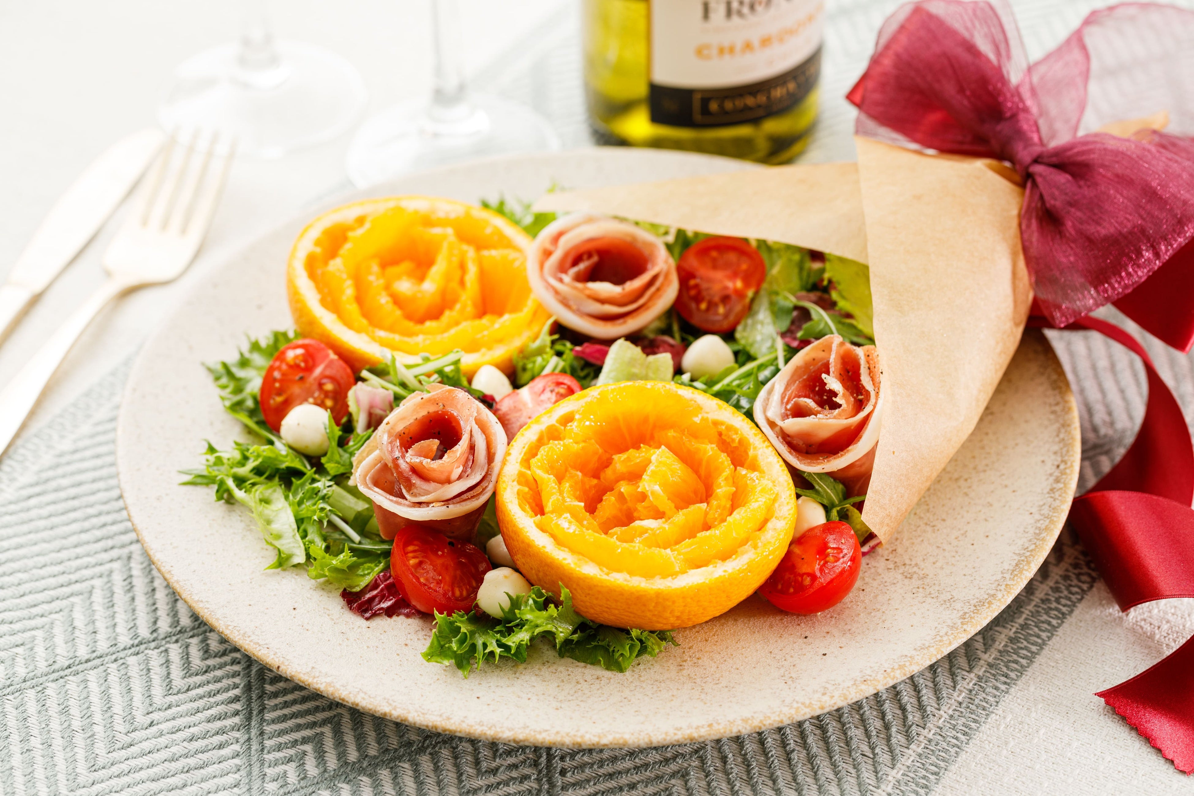 特別な日や記念日を彩る期間限定のサラダメニューです。ごまのような香りが特徴のセルバチコをはじめとする、4種の葉物野菜を贅沢に使用しました。オレンジの甘味、トマトのほんのりとした酸味、生ハムの旨味が織りなすハーモニーをお楽しみください。