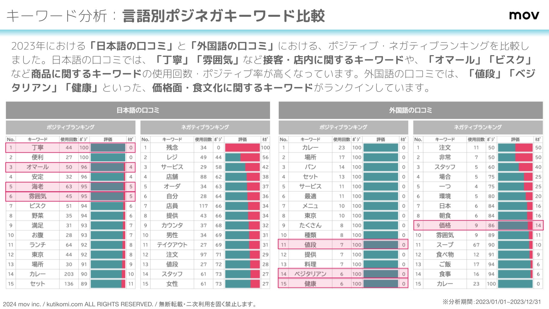 2023年における「日本語の口コミ」と「外国語の口コミ」における、ポジティブ・ネガティブランキングを比較しました。