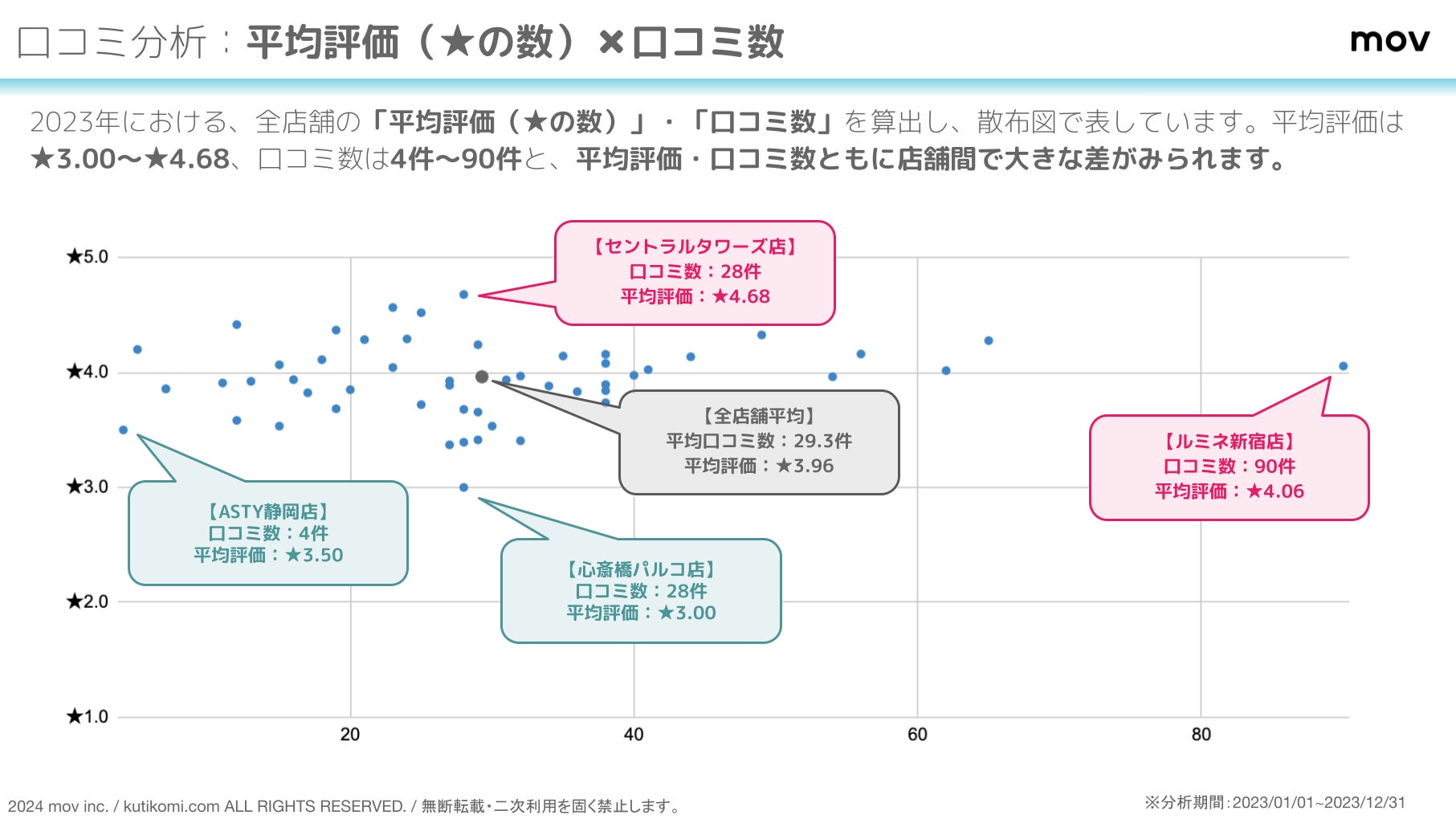 2023年における、全店舗の「平均評価(★の数)」・「口コミ数」を算出し、散布図で表しています。