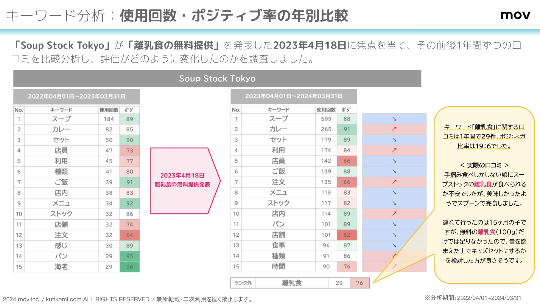 「Soup Stock Tokyo」が「離乳食の無料提供」を発表した2023年4月18日に焦点を当て、その前後1年間ずつの口コミを比較分析し、評価がどのように変化したのかを調査しました。