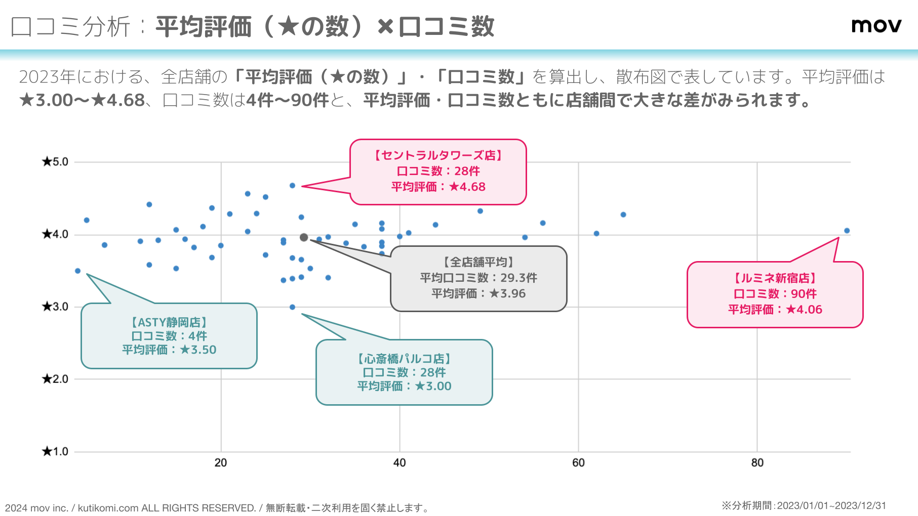 2023年における、全店舗の「平均評価(★の数)」・「口コミ数」を算出し、散布図で表しています。
