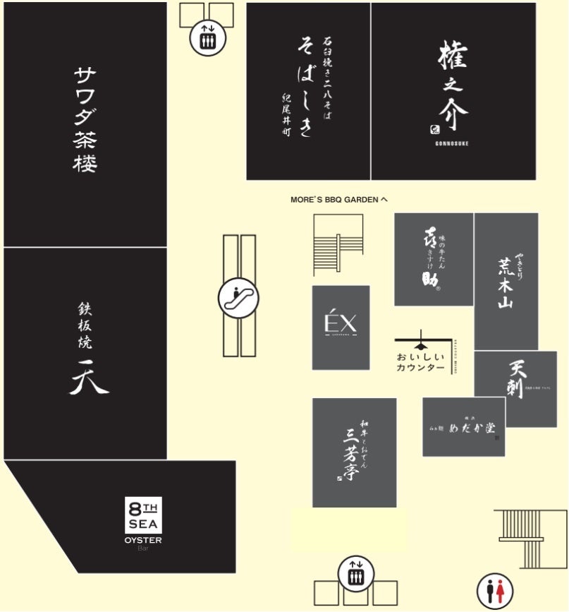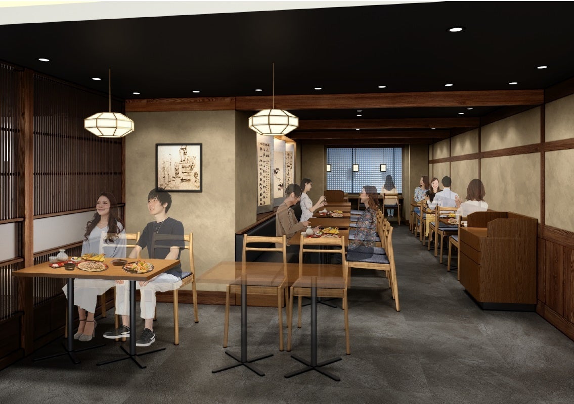 今回のリニューアルではフロアの中央に、お一人様でも気軽にご利用いただける6店舗を集約した「おいしいカウンター」ゾーンを構えます。カウンターをメインとした店舗で構成されており、スペインバル・パエリア「EX yokohama」、牛たん専門店「味の牛たん 喜助」、炭火焼き鳥・ワイン「やきとり 荒木山」、匠の丼「天麩良&刺身 天刺」、匠ラーメン「横浜 らぁ麺 めだか堂」、和牛ひつまぶし・おでん「和牛とおでん 三芳亭」が出店。レストランフロア全体で、“美食家が集う場所”を目指します。
