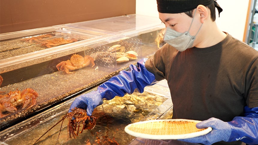 嚶鳴では、オーダーが入り次第、いけすから活きた貝や海老を取り出しお客様の目の前で調理していきます。