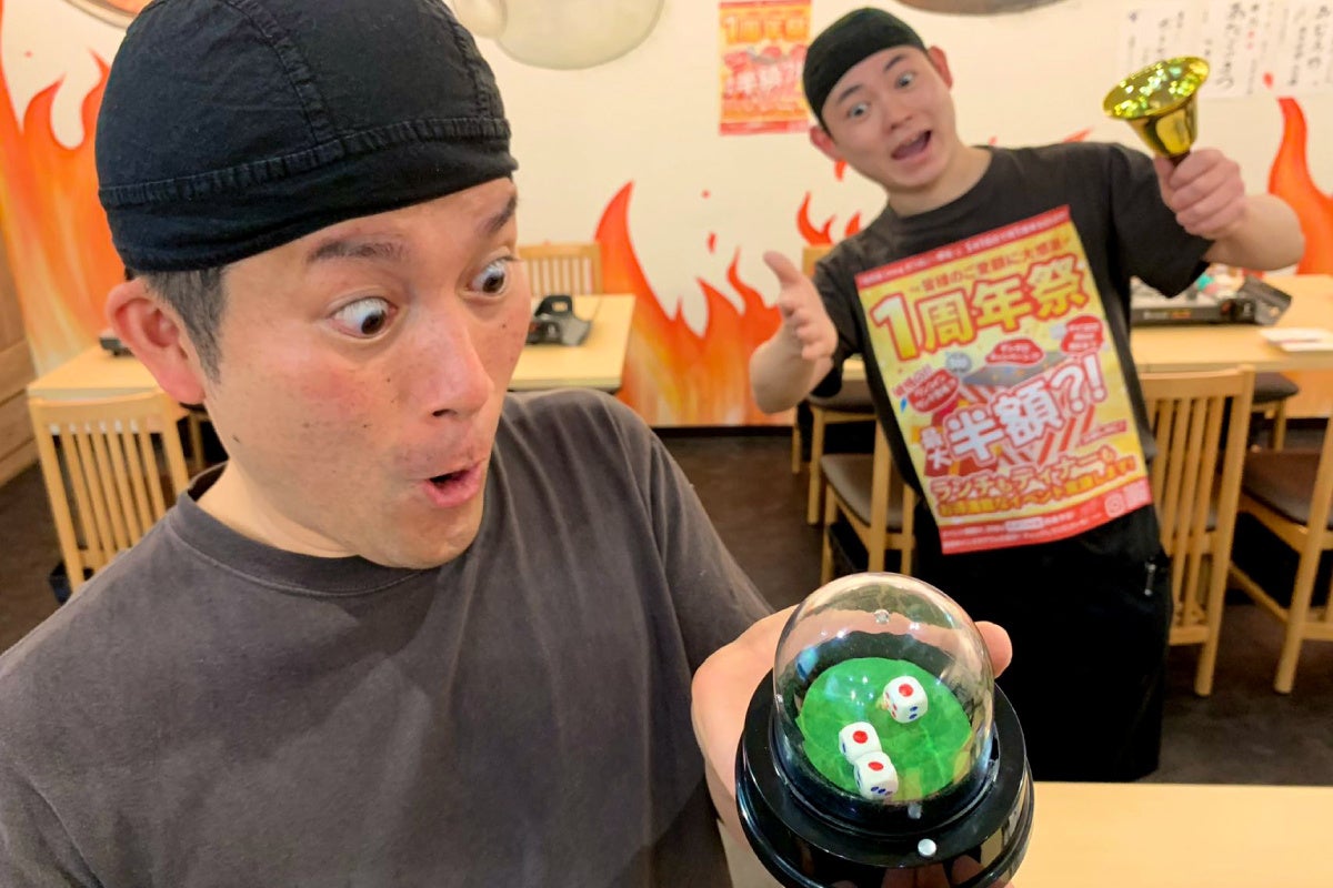 1周年記念として、お客様に楽しんでもらいたいという思いから企画した「チンチロキャンペーン」。3つのサイコロの合計により、お会計金額を値引きいたします。最低でも10%OFF、ゾロ目が出ると最大50%OFFの半額となります。