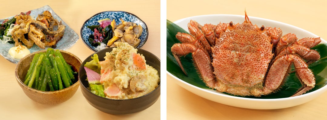 ホタテの旨煮が入った自家製ポテサラなど、箸休めにぴったりの一品メニューは¥380~。【入荷時のみ】活きた蟹を丸ごと蒸し上げる、数量限定蒸し毛蟹も!