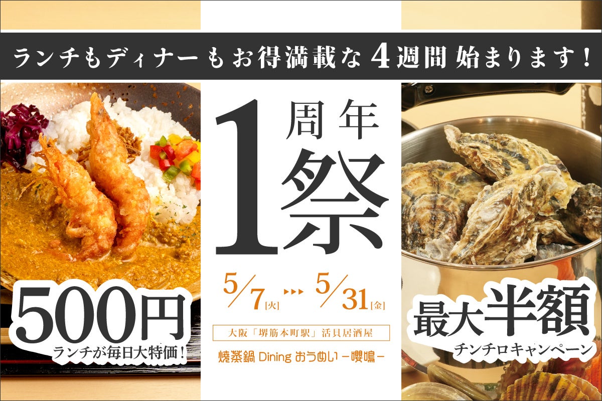 大阪 堺筋本町駅にある活貝居酒屋『焼蒸鍋Dining おうめい-嚶鳴-』では、2024年5月7日(火)~5月31日(金)まで、昼も夜もお得になる1周年記念イベントを開催いたします。